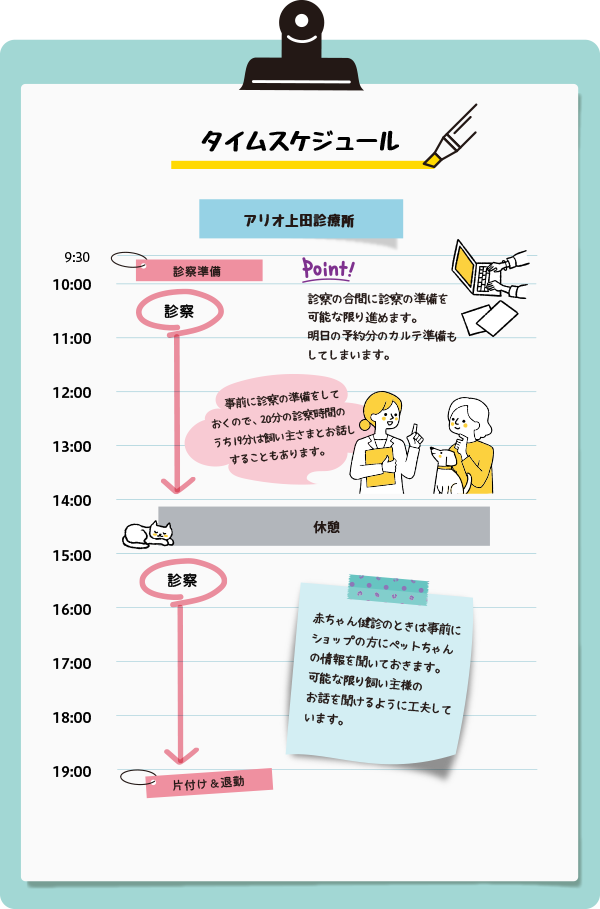 磯貝:予防医療に関心のある先生や、飼い主さまと会話が足りていないと感じている先生は、一度扉を叩いてみてください。基本的な診療から会計の流れを押さえておけば、1コマ20分間の予約枠をどう使うかは先生次第なんです。